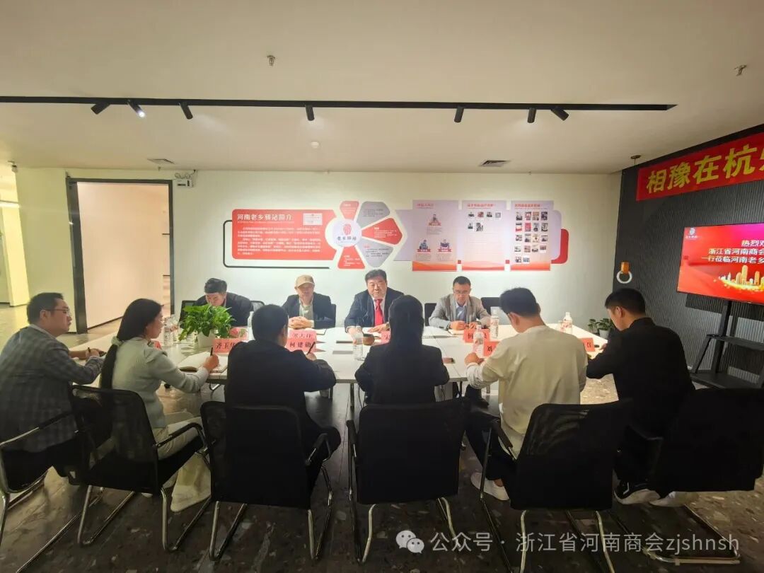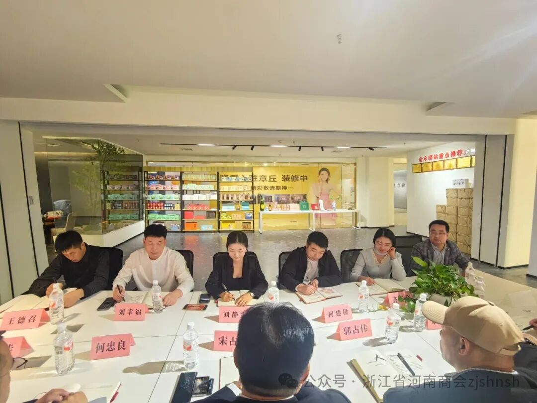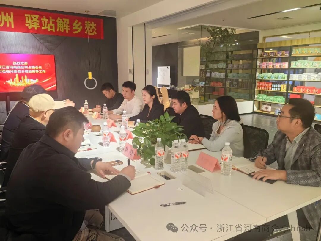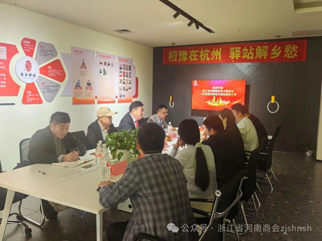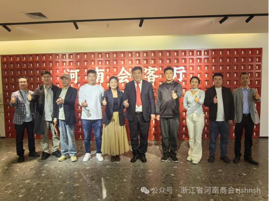 浙江省河南商会会长宋占锋、监事长郭占伟、秘书长、梅佳;老乡驿站(杭州)企业服务有限公司总经理刘静雯、刘幸福、王德召、齐玉华、王兴仁、耿培、参加此次走访座谈