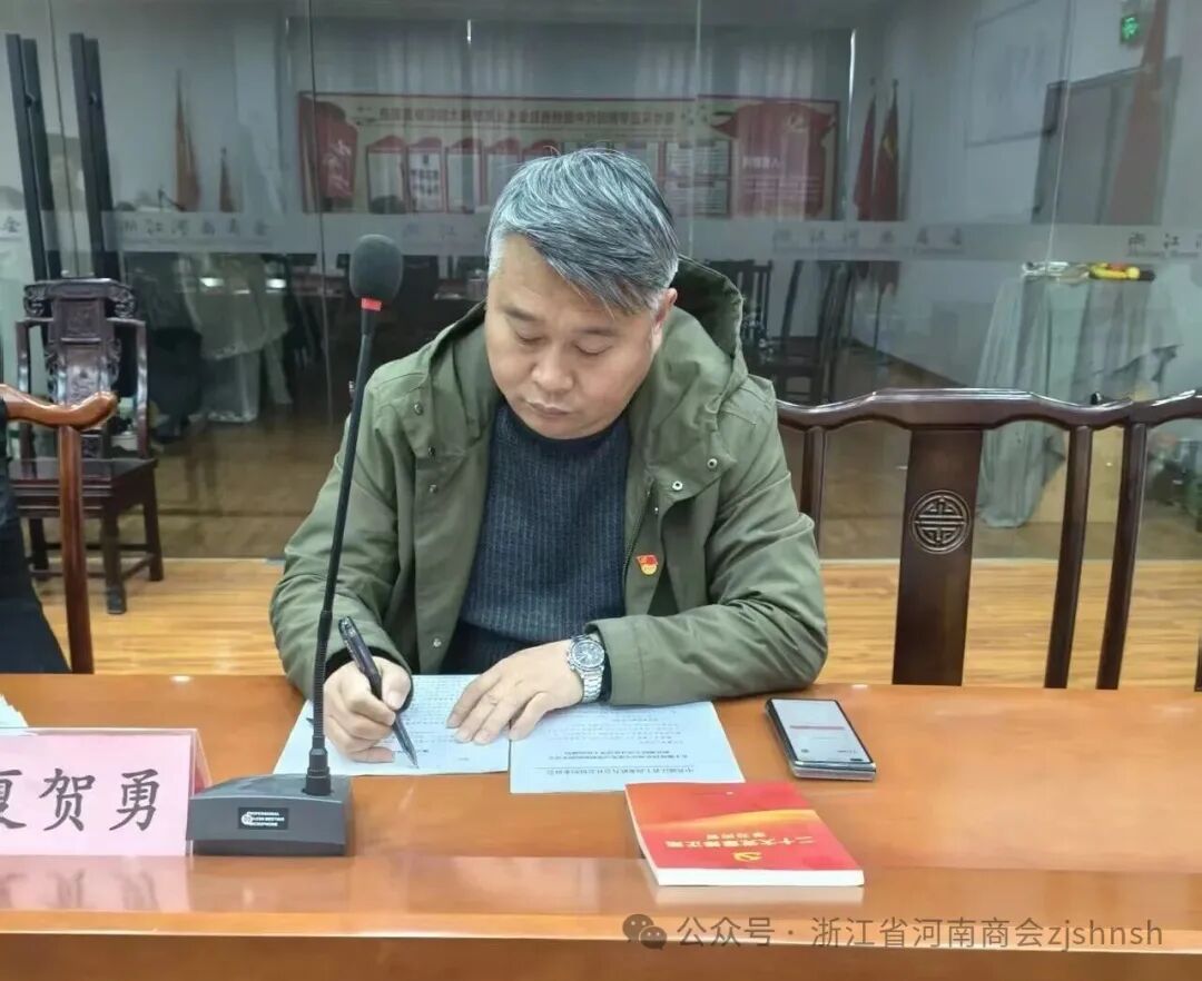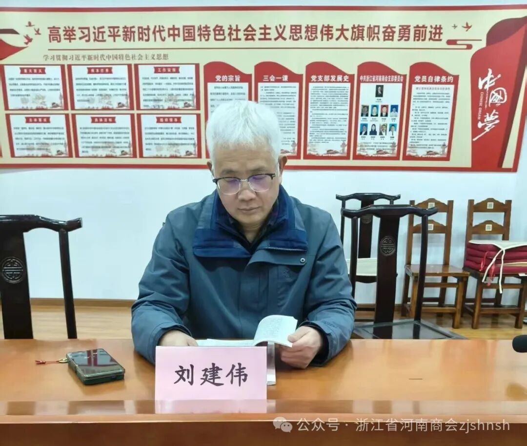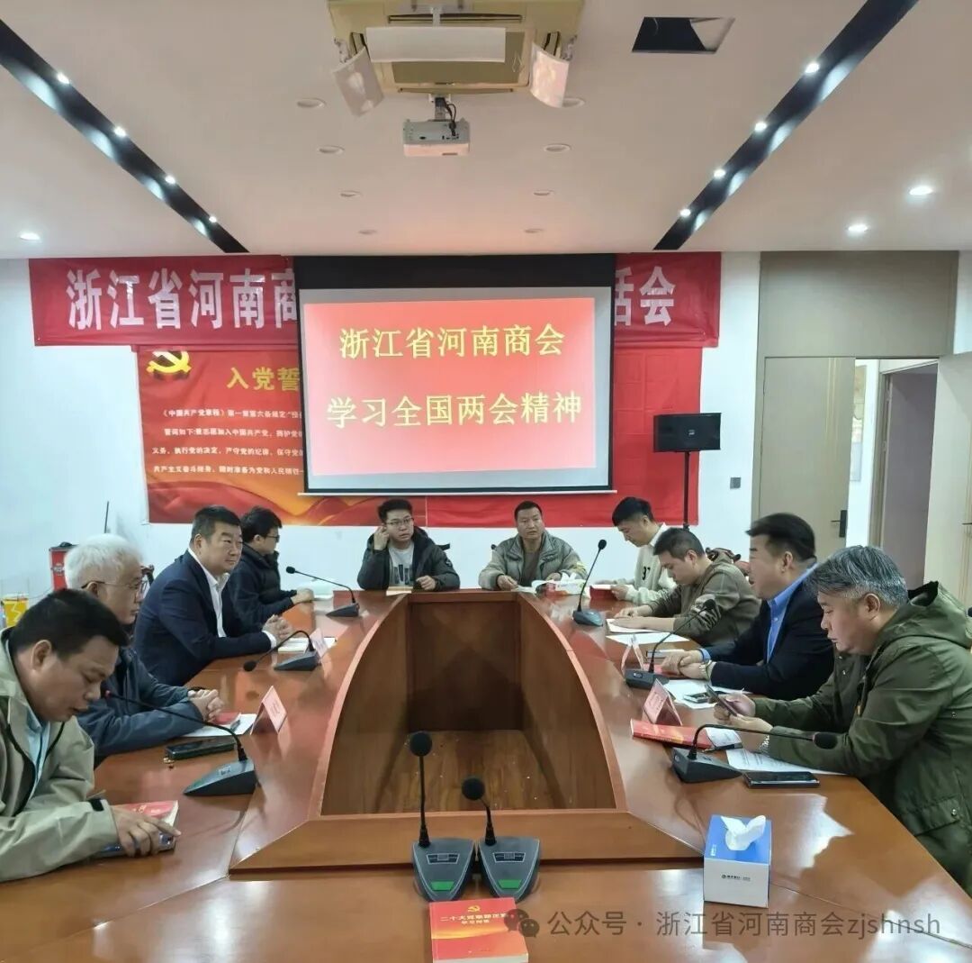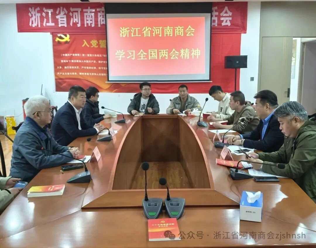 2026年3月15日,浙江省河南商会党支部根据省工商联社会组织委员会的党建工作提示和要求,组织党员学习全国两会精神和习总书记的重要讲话精神,党支部书记、会长宋占锋主持会议,组织委员、执行会长宋占川,党员、执行会长夏贺勇、执行会长刘建伟、监事长郭占伟、秘书长及入党积极分子等参加学习会议。